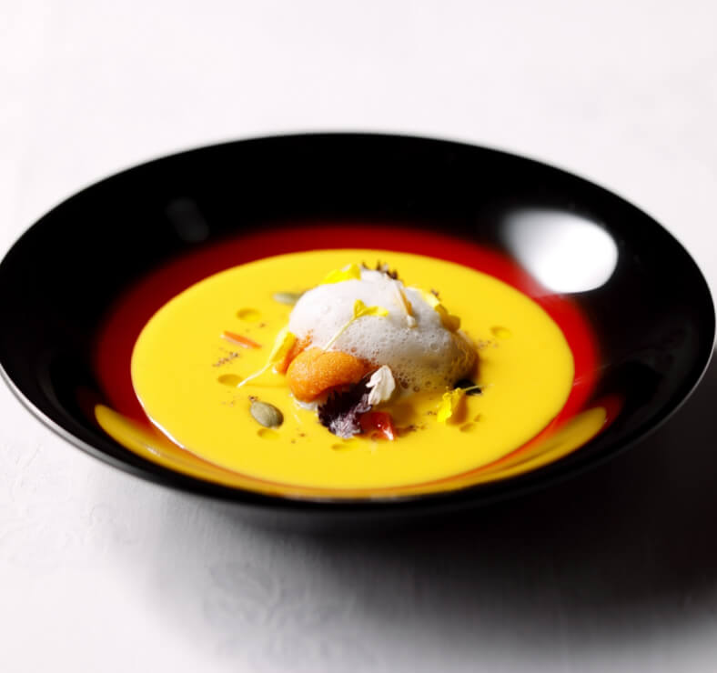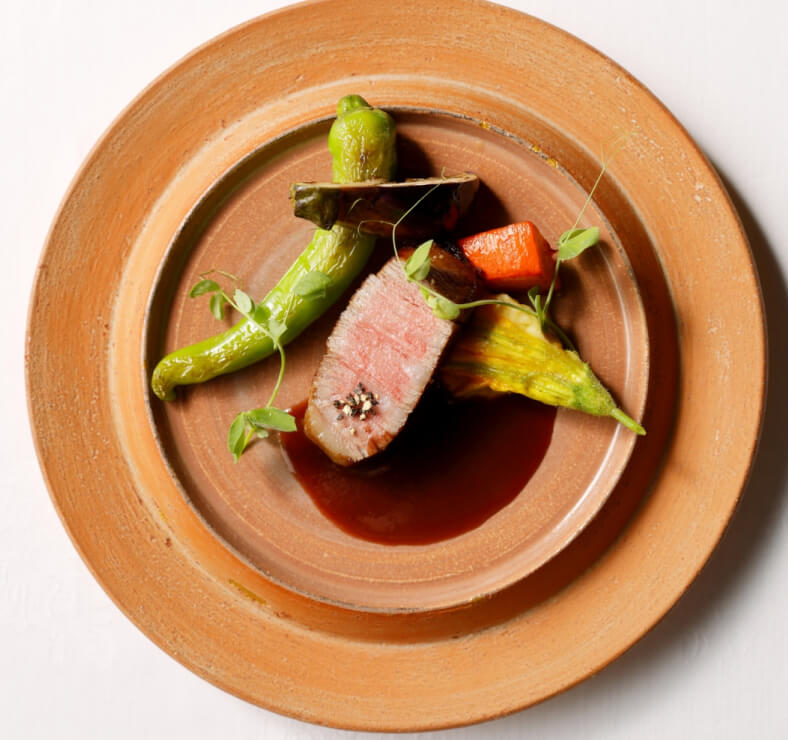 厳選された有機野菜や加賀野菜、金沢港や能登島直送の鮮魚、地元の旬の食材や地産地消を心がけ、九谷焼・珠洲焼・輪島塗など石川県の伝統工芸品の器で彩るフランス料理レストランです。2024年からは「能登応援メニュー」として、能登直送の旬食材で彩るお料理を提供しています。〈金沢大地〉のオーガニック小麦を使った自家製パンも人気です。